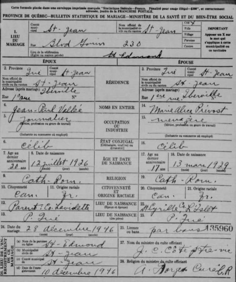 Vallée Jean-Paul & Marie Alice Prévost, Acte de mariage