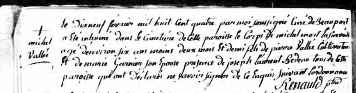 L'information citée provient deun manuscrit publié par Paroisse Notre-Dame de Beauport, Qcà Beauport, Qcle 19 février 1804, conservé à Paroisse Notre-Dame de Beauport, Qc. (Réf: 1804 +). L'auteur/concepteur était Renaud, ptre, curé. Cette citation est considérée comme étant une évidence directe, formelle et non-discutable.